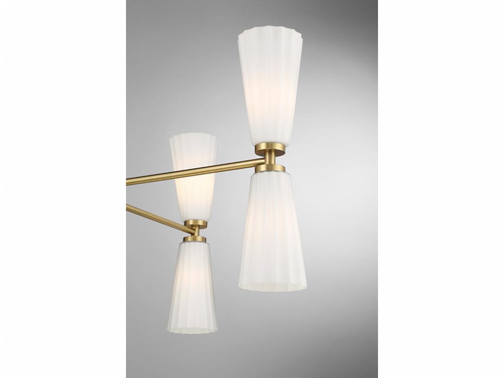 Timelessly beautiful and elegant, this 8-light chandelier is sure to brighten your home in style. Its alluring white fluted glass shades add a thoughtful touch of texture and pair nicely with the Natural Brass finish. The height is adjustable from 14.5" to 74.5" and the width is 32". It comes with four 12" downrods and one 6" downrod. Uses 8 candelabra size bulbs of up to 60 watts per bulb. Bulbs not included.