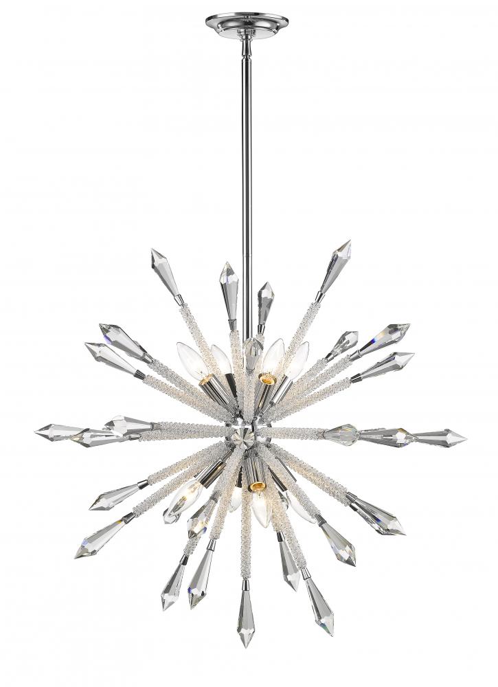 Bring elegant energy to any space with the fresh design of this eight-light chandelier. Crafted from chrome finish iron and clear crystal, its radiant spherical silhouette sends crystal stems with iron accents exploding in uniform alignment, creating a chic artistic effect.