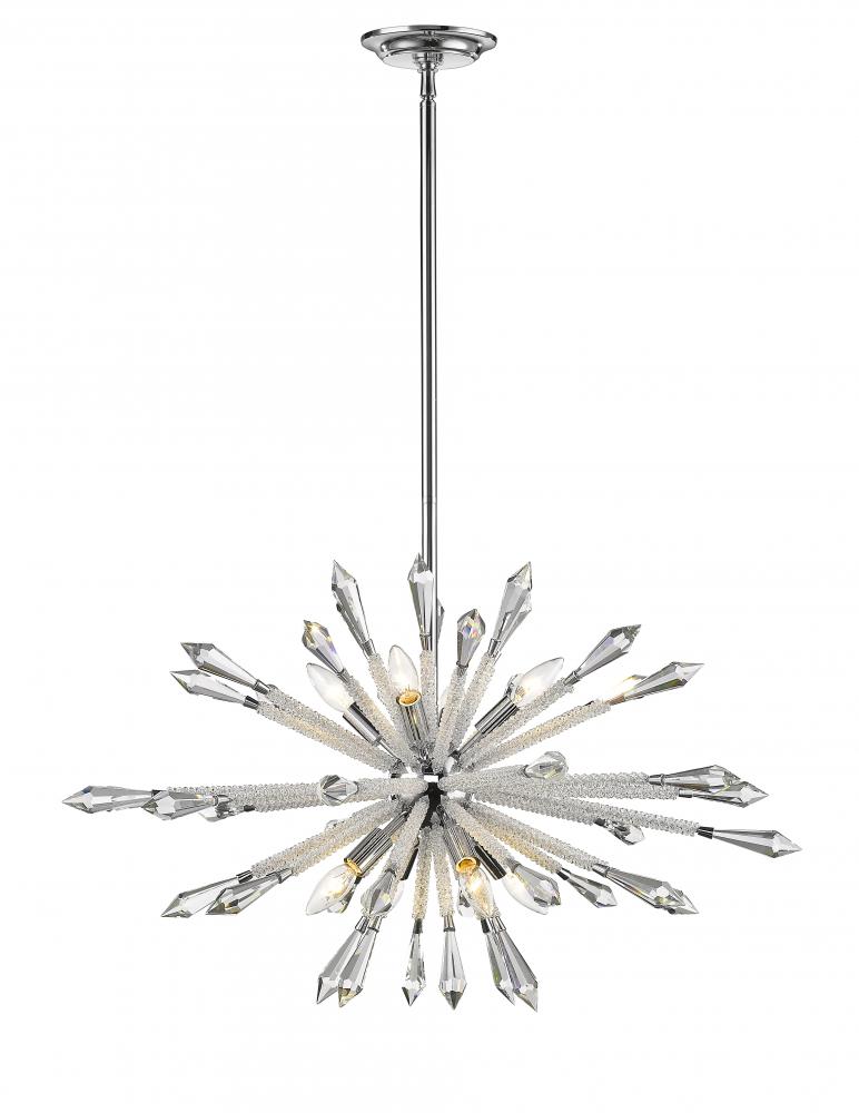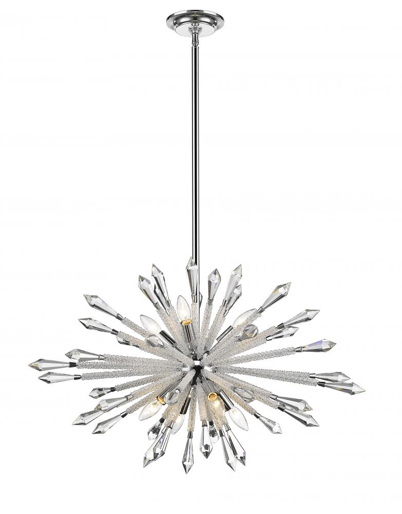 Gallery influence adds an artistic, detail-rich aesthetic to this chrome finish iron and crystal glass eight-light chandelier. Highlight a custom dining ensemble or entryway with a polished fixture emulating an energetic, explosive style.