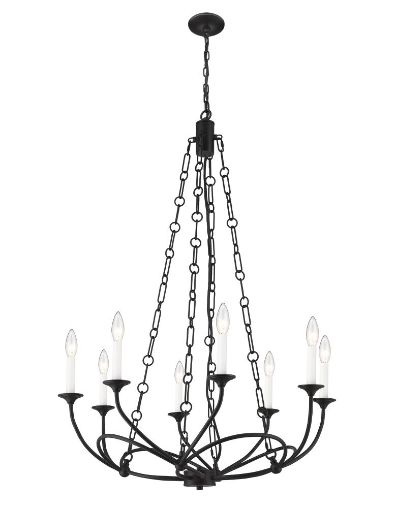 Capture a theatrical motif with artistry and romance worthy of a custom space with an eight-light chandelier leaving a lasting impact. From the Arabella Collection, this exquisite fixture maintains a flowery symmetrical motif in spite of its bold matte black finish steel construction. A ribbon-like design accents its chicly arched frame with charming candelabra bulb mounts that soften edgy character.