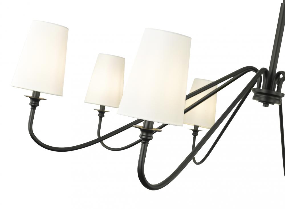Swooping arms bring modern minimalism to a chic eight-light chandelier. From the Gianna collection, its a compelling, pared-down look that prioritizes elegance and beautiful illumination with opaque white shades and a matte black finish that lends just the right touch of casual allure.