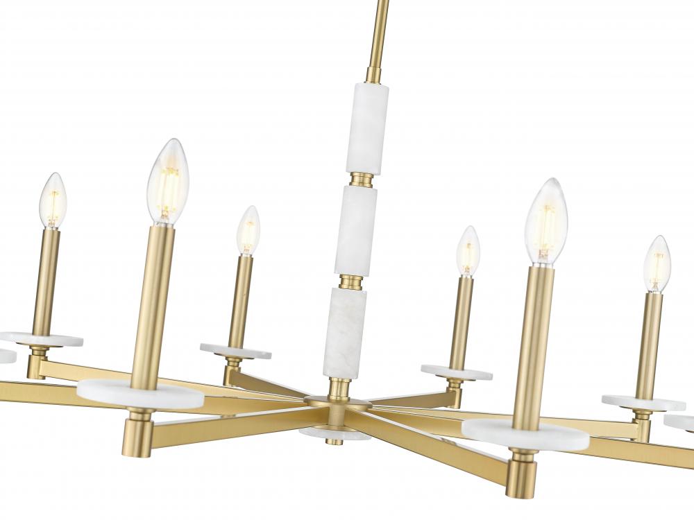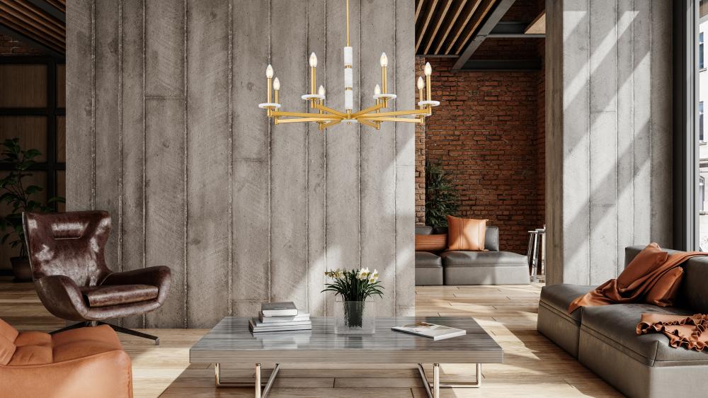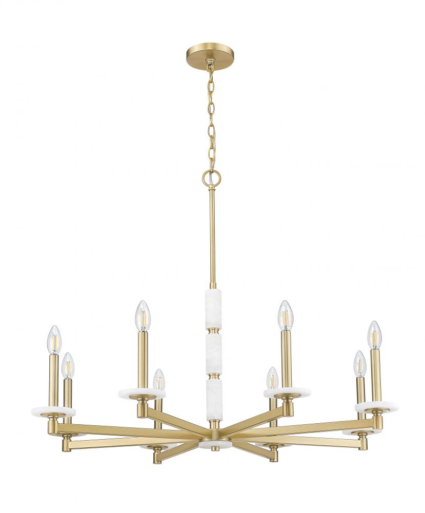 Looking for an effortless fusion of warmth, balance, and beauty? The modern gold frame of this stunning eight-light chandelier curves gracefully around eight alabaster spheres, each one glowing with a natural, calming light. It brings softness to high ceilings and a golden tone to every gathering.