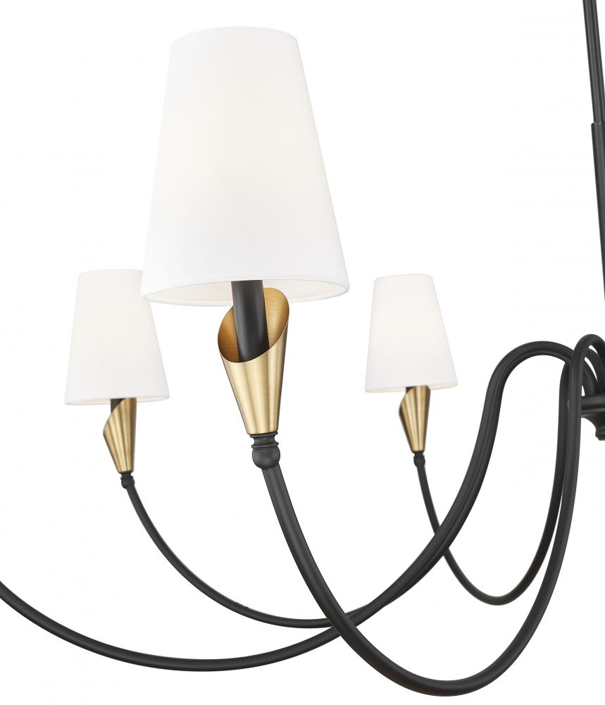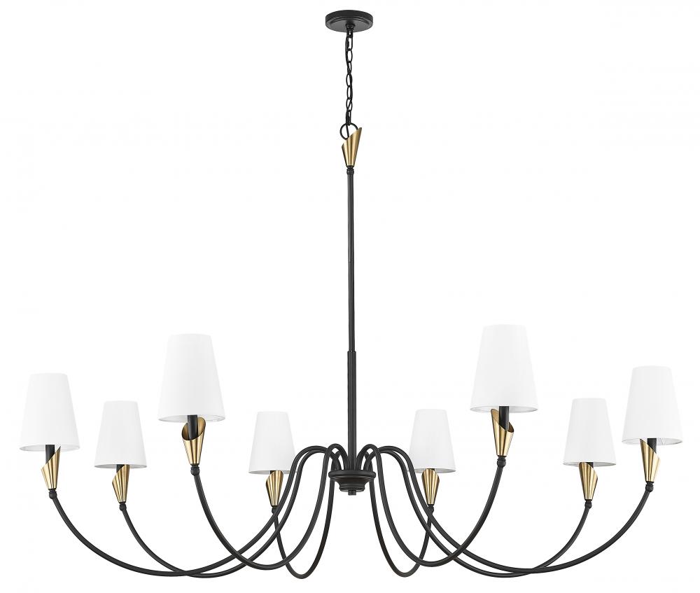 Simple elegance radiates from a modern eight-light chandelier that showcases versatile transitional style over a foyer or dining room. Swooping arms bring graceful flair, highlighting a slim silhouette, with each capped with a delicate linen shade for excellent illumination and inviting ambiance.