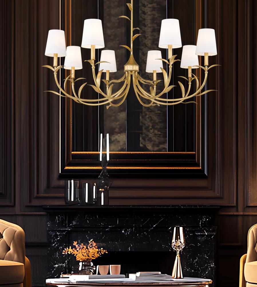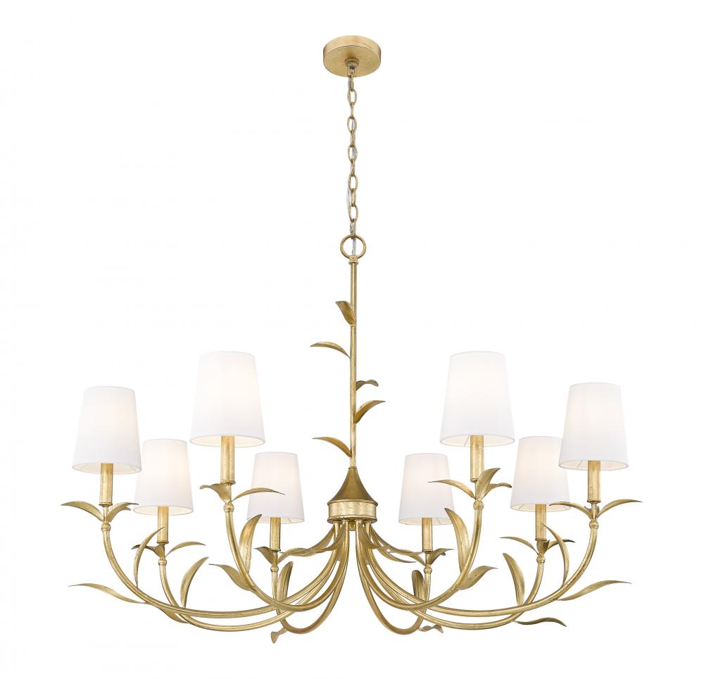 Ultimately elegant lighting takes on a botanical vibe in a chic, sophisticated eight-light chandelier crafted of warm gold leaf finish steel. Artisan flavor delivers exquisite silhouetting with curved arms and delicately shaped fronds, weaving in a natural aesthetic. Smooth holders and candelabra bulb bases make possible dimmable light levels, adding mood illumination to dining rooms, foyers, and large bedrooms.