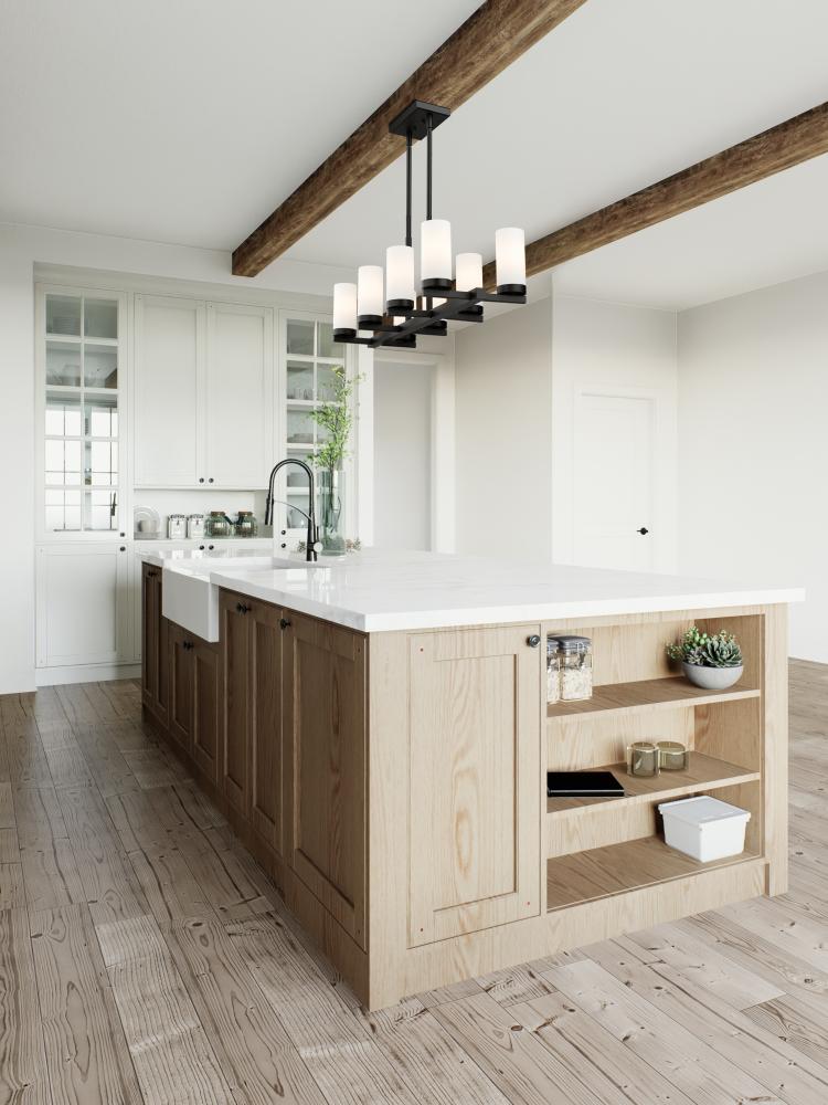 Put the finishing touches on a revamped kitchen or dining room with a modern eight-light linear chandelier. Perfect for a kitchen island or a long, inviting dining table, it boasts a clean, straight silhouette emphasized with a matte black finish. Shades are cylinders of white glass, creating contrast while delivering bright, diffused illumination for ambiance and tasks.