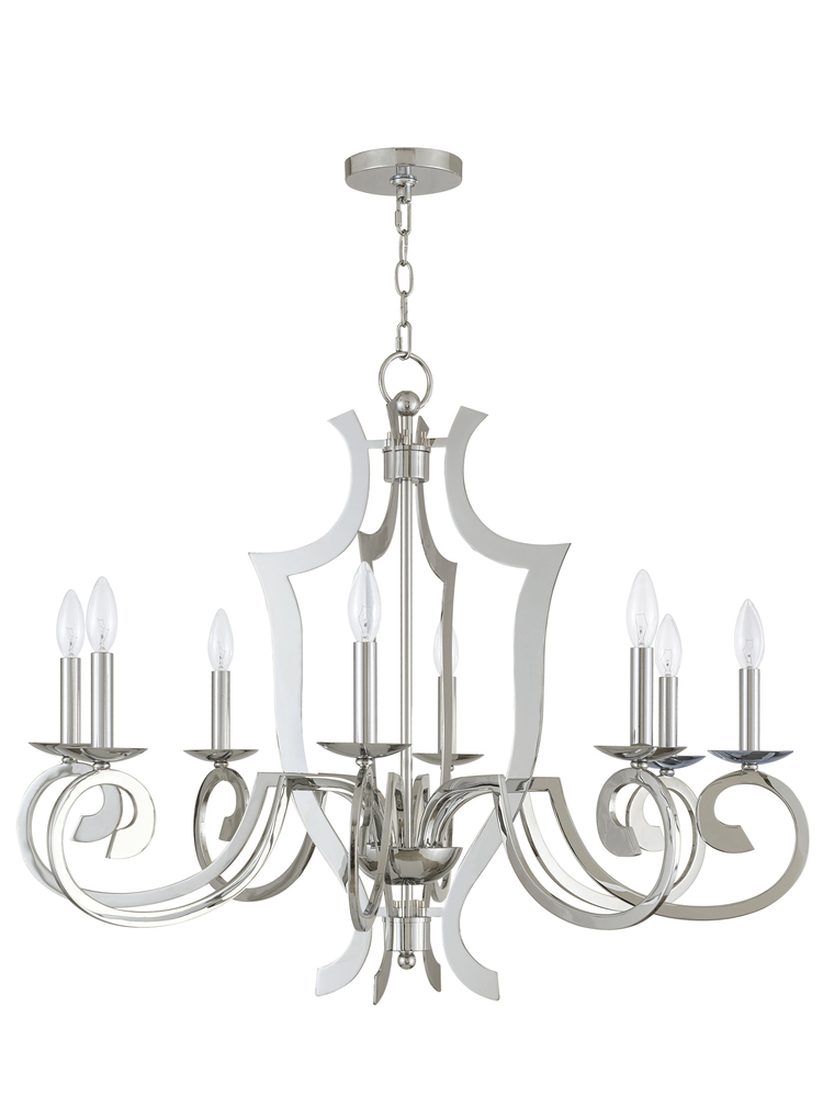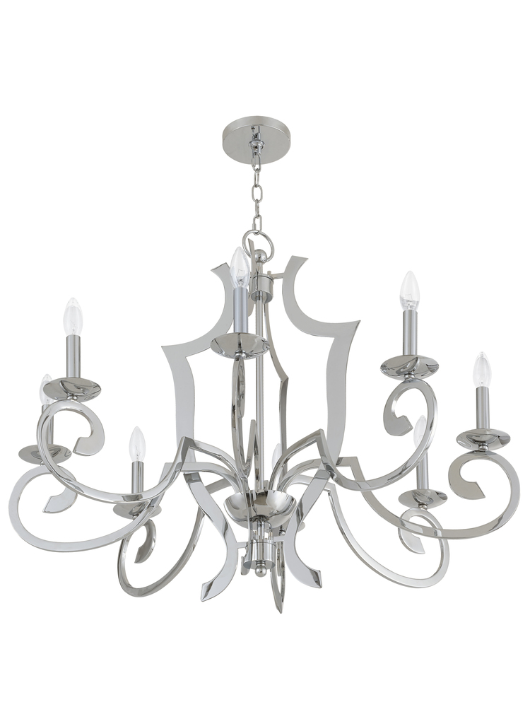 This Euro-Chic Dimensional Eight Light Chandelier Features A Laser-Cut Metal Openwork Frame Enhanced With Polished Chrome Finish.