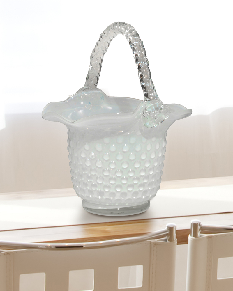 This delightful White Basket is the perfect accessory piece to tuck away into any space in your home. Hand blown entirely of Favrile Art Glass, the pretty little basket features an allover design of raised dots to emulate a basket weave effect. The handle is clear glass and features a floral motif where it joins the basket. A matching round base of clear glass balances the piece. The wide, ruffled mouth gives way to an inner wall of pure alabaster to create a beautiful monochromatic effect. Our White Basket is the perfect accent piece on a shelf or bookcase, whether displayed alone or filled with small collectables. Try using it on a dresser or vanity table to hold your favorite items of jewelry or as the perfect gift for the special lady in your life.