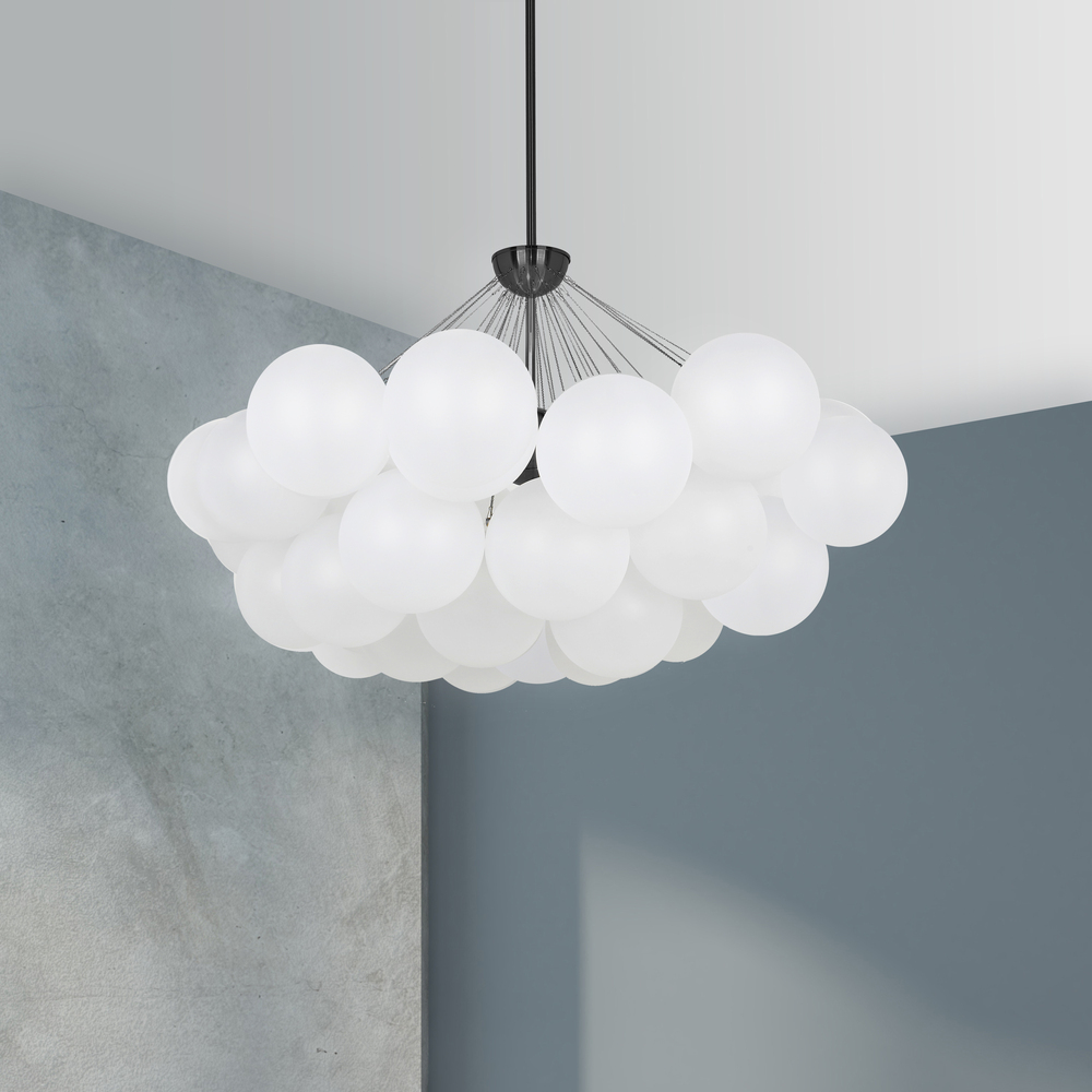 The Miles family of fixtures takes its inspiration from the buoyant appeal of balloons. Available in chandelier or flush mounted configurations, it's a funky take on contemporary designer style. The metal frame is rounded, creating a symmetrical design for either configuration. Light emanates in all directions from large globes, with a frosted finish for a skin-friendly glow. Miles lighting adds a bold stroke to contemporary décor schemes, and delightful curved lines to contrast minimalist furnishings. Its striking look is suitable for living rooms, bedrooms or an office setting.