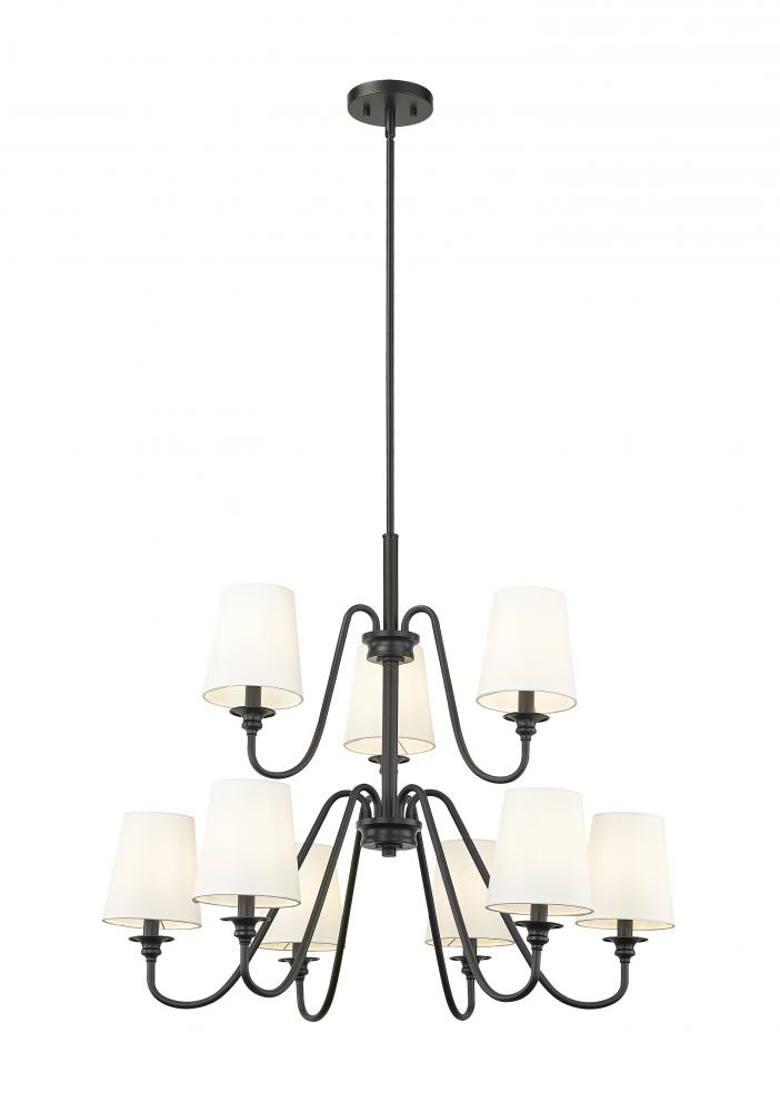 Pleasingly pared down, this modern two-tier chandelier is a superb choice over a dining table or staircase. Slim J-shaped arms create a sense of delicacy, while a matte black finish creates depth and contrast in a contemporary living or dining room. Nine lights glow from behind opaque white shades, offering refined, true illumination and excellent ambiance.
