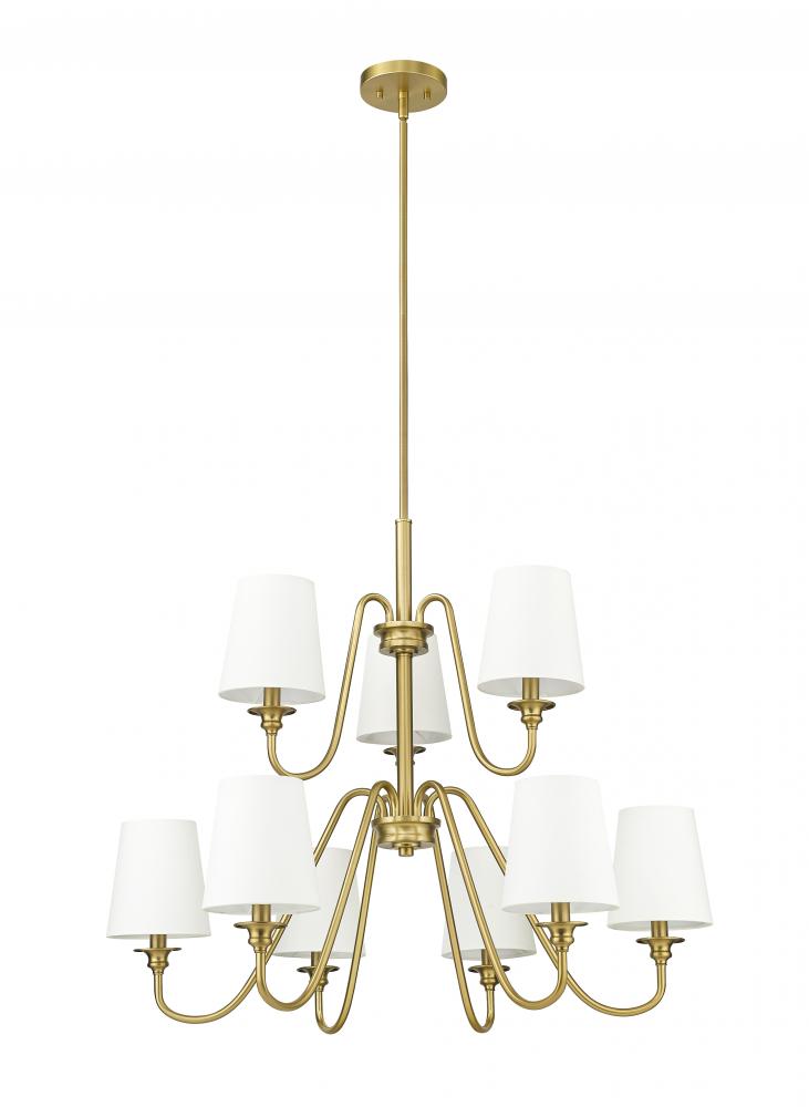 Pleasingly pared down, this modern two-tier chandelier is a superb choice over a dining table or staircase. Slim J-shaped arms create a sense of delicacy, while a modern gold finish creates warmth and depth in a contemporary living or dining room. Nine lights glow from behind opaque white shades, offering refined, true illumination and excellent ambiance.