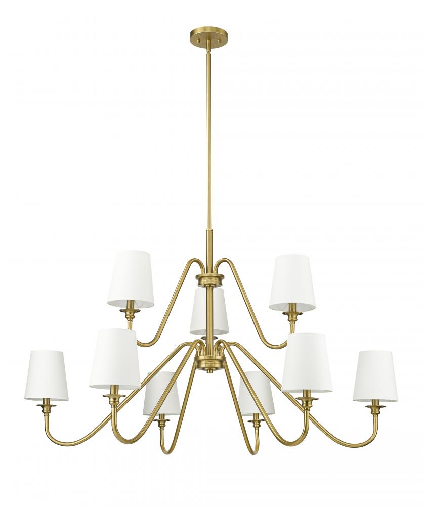 Pared-down silhouetting creates a pleasing profile for a modern two-tier chandelier thats an exceptional choice over a dining table or staircase. Slim, sloping arms are delicate and minimal, while a modern gold finish lends contrasting warmth to youth contemporary living or dining room. Nine lights glow from behind opaque white shades, offering refined, true illumination and excellent ambiance.
