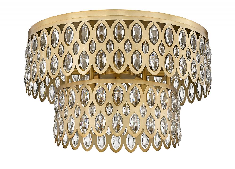 Wide double tiers showcase the sparkling crystal baubles that define this Dealey collection nine-light flush mount ceiling light. An heirloom brass finish is both warm and welcoming, delivering richness and elegance in a piece that mimics a classic chandelier while demanding much less ceiling clearance. Glittering crystal ensures a look thats both glam and elegant, offering eye-catching ambiance in your elevated living space.