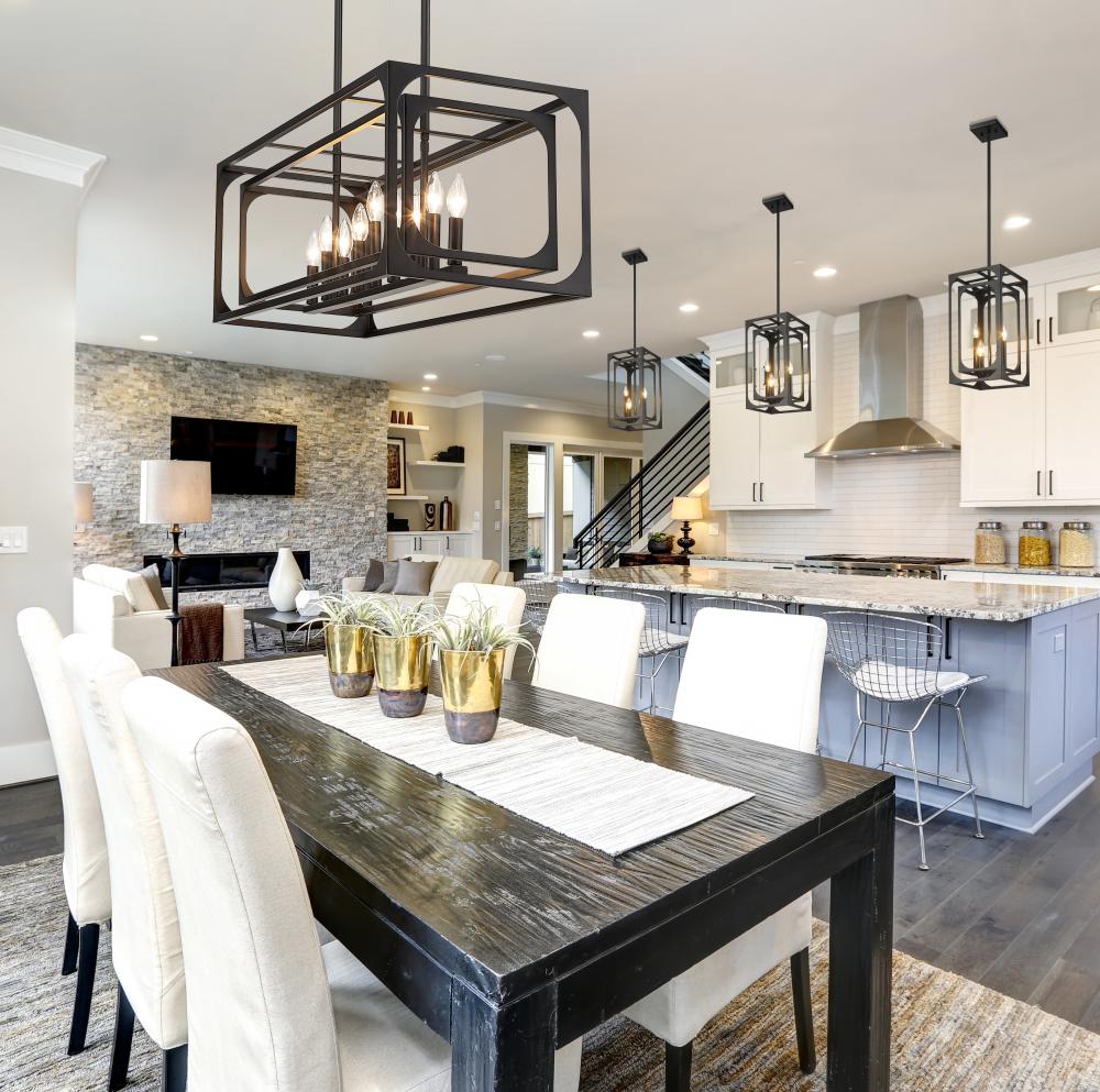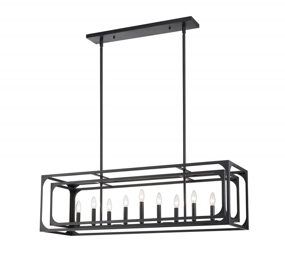 Adding a nod to trending modern farmhouse style, this industrial-inspired fixture is a grand option for illuminating compact kitchen and entertaining spaces. Linear elements and an orderly aesthetic enhance the Easton nine-light island light, adding a romantic theme with charming candelabra bulb mounts set in a graduated arrangement and centered in full view thanks to a dual-layered openwork matte black finish metal frame. Symmetry and minimalism reflect a sought-after effect with limitless personality.