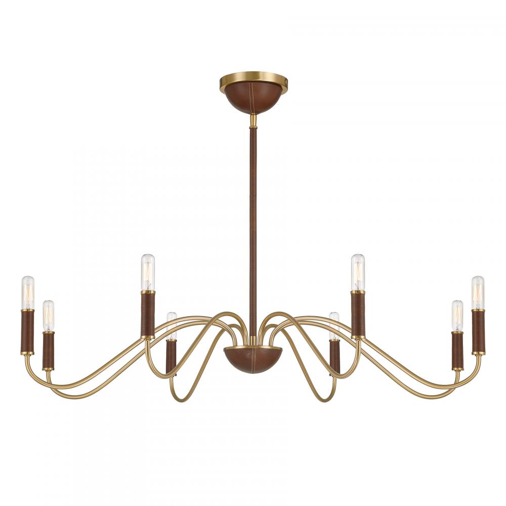 Discover the stately stylings of the Savoy House Abeline 8-light chandelier, which is decorated with natural leather to add richness and texture. You can even see evidence of the careful craftsmanship through detailed stitching on the ceiling canopy and finial! The Warm Brass finish pairs up perfectly with the chestnut tone of the leather. Abeline is 39" in width and has an adjustable height ranging from 6" to 64". Uses eight candelabra size bulbs of up to 60 watts per bulb. Bulbs not included. Comes with four 12" downrods and one 6" downrod.