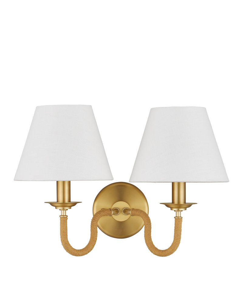 The Adala Brass Wall Sconce is crafted from metal with a warm brushed brass finish. Its timeless silhouette features two gracefully curved arms, each wrapped in natural rope for added texture and a coastal-inspired touch. Atop each arm sits a classic off-white linen shade, diffusing light softly for a warm, inviting glow. This sconce adds sophisticated character to hallways, living spaces, or bedrooms, perfectly complementing both classic and transitional interiors.