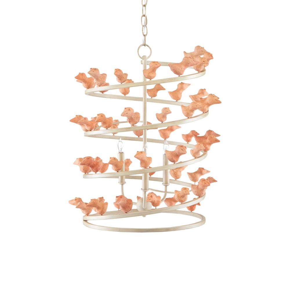The Adarna Chandelier is a playful composition inspired by nature. Handmade terracotta birds in three sizes watch attentively from their spots on the circular frame made of wrought iron in an antique silver leaf finish. These fledglings were not created in molds; they were fashioned by human hands, so each one is unique. Adjustable from 38" to 108" with use of included chain/rod kit/cable. If your space calls for a longer drop, additional chain/rods/cable is available for purchase.
