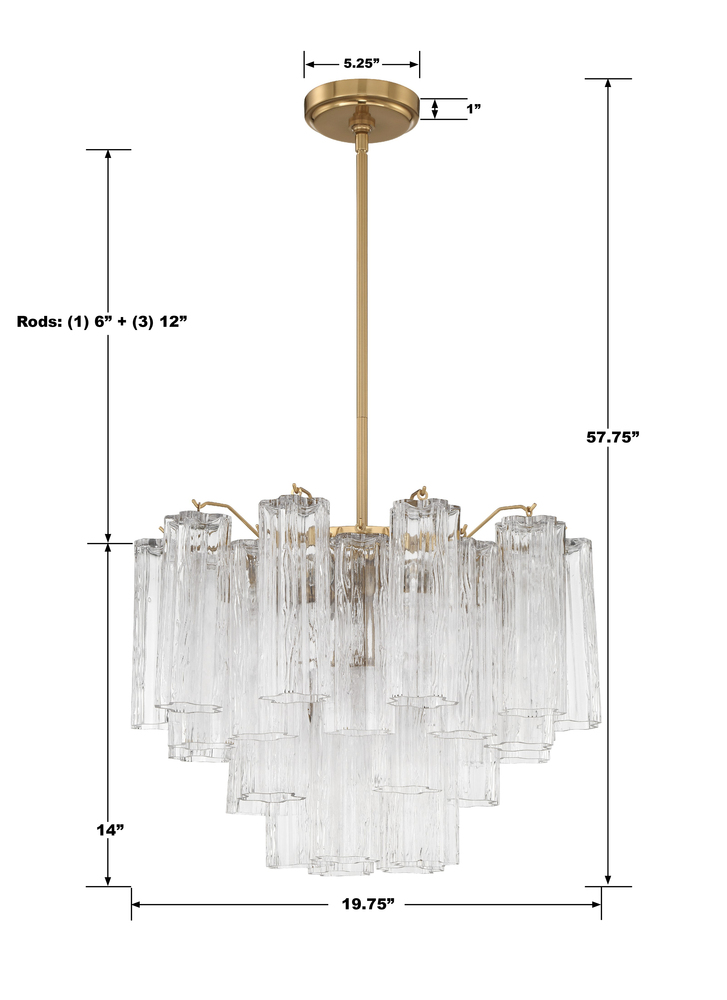 The captivating Addis Lighting Collection is a modern-day interpretation of the iconic mid-century Tronchi chandelier. Inspired by its predecessor's sleek lines and geometric shapes, the Addis features a polished Chrome or Aged Brass metal frame that exudes sophistication and style. Its unique design showcases transparent tiers of textured Tronchi glass tubes, forming a mesmerizing 5-point rounded star shape. Choose from a range of glass colors, including clear, amber, smoke, and white, or the stunning Autumn option, which features a captivating multicolor disposition of amber, clear, and smoke Tronchi glass. The Addis Lighting Collection offers various sizes and finishes, allowing you to find the perfect fit for your space while adding a touch of timeless elegance.