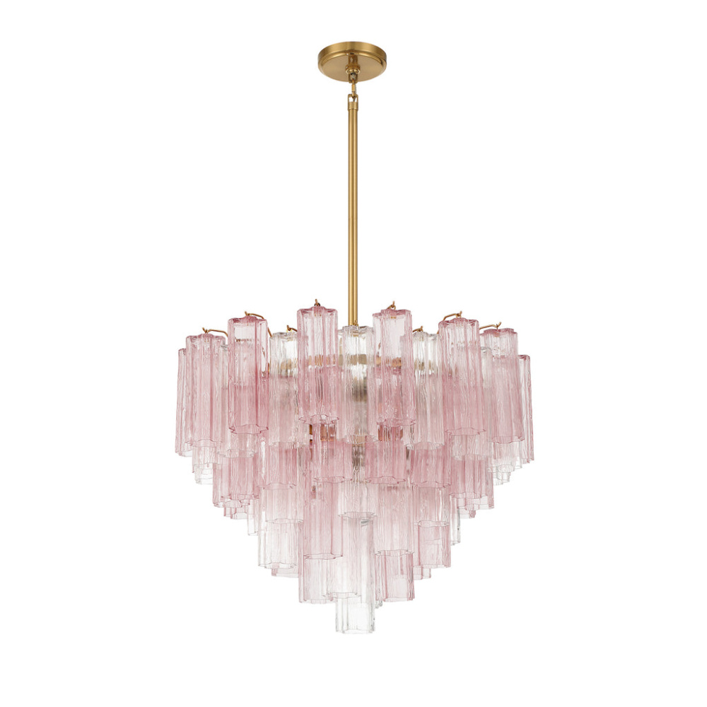 The captivating Addis Lighting Collection is a modern-day interpretation of the iconic mid-century Tronchi chandelier. Inspired by its predecessor's sleek lines and geometric shapes, the Addis features a polished Chrome or Aged Brass metal frame that exudes sophistication and style. Its unique design showcases transparent tiers of textured Tronchi glass tubes, forming a mesmerizing 5-point rounded star shape. Choose from a range of glass colors, including clear, amber, smoke, and white, or the stunning Autumn option, which features a captivating multicolor disposition of amber, clear, and smoke Tronchi glass. The Addis Lighting Collection offers various sizes and finishes, allowing you to find the perfect fit for your space while adding a touch of timeless elegance.