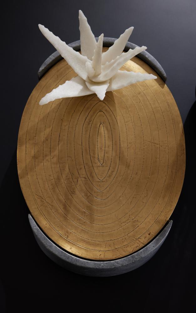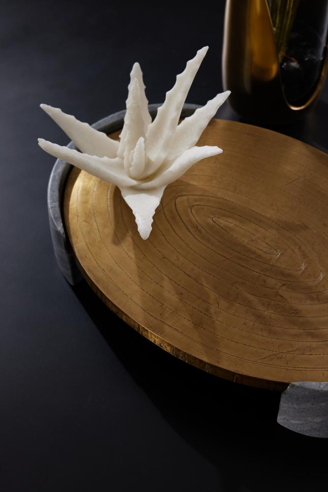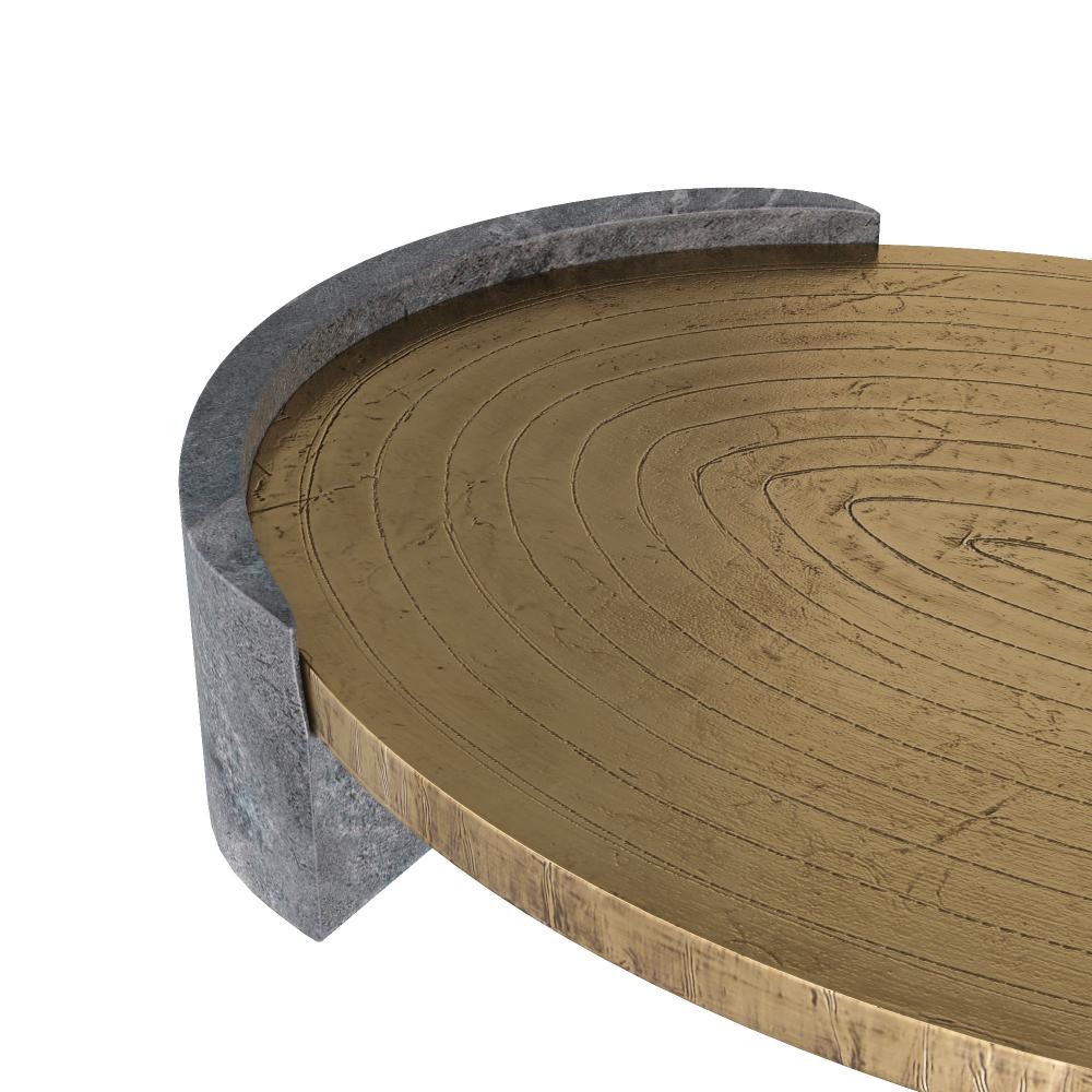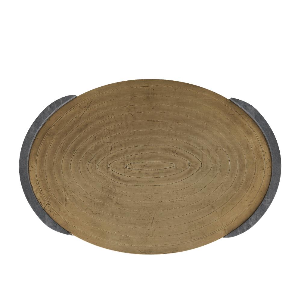 Suspended with supports of grey marble, an antique brass clad oval offers a pleasing mix of materials. Carved at the top with a concentric pattern, it is an impactful accessory for any surface. Finish will vary.