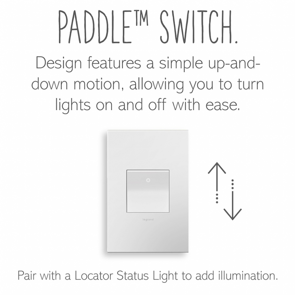 A sleek update to the standard toggle, this modern light switch lets you turn lights on and off with ease and style. Use this 20A light switch on its own to control a light or fixture from a single location, or pair with a second switch for 3-way control.This switch* features enduring Microban? antimicrobial technology that works to reduce the growth of bacteria, around the clock, for the lifespan of the product.* Existing inventory of switches, dimmers and plastic wall plates from the adorne? Collection at some partner locations may not yet include Microban? protection. To confirm that a specific Legrand product is protected with Microban?, check that the exterior of the product packaging includes a green dot or a ""Protected with Microban"" label.Made exclusively for use with screwless Wall Plates from the adorne? Collection, sold separately.No antimicrobial efficacy claims are being made or are valid with respect to products sold in Canada.