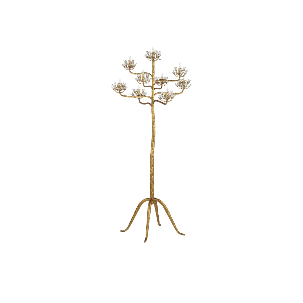 The Agave Americana Floor Candelabra is a grand piece inspired by the Century plant of the American desert. Nine lights are surrounded by clusters of faceted crystals fitted to branches of hand-forged metal tubes in a contemporary gold leaf finish. The gold floor lamp is in our Marjorie Skouras Collection.