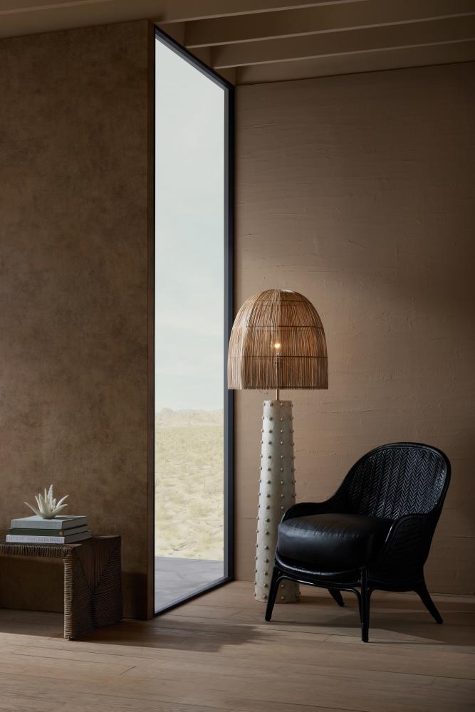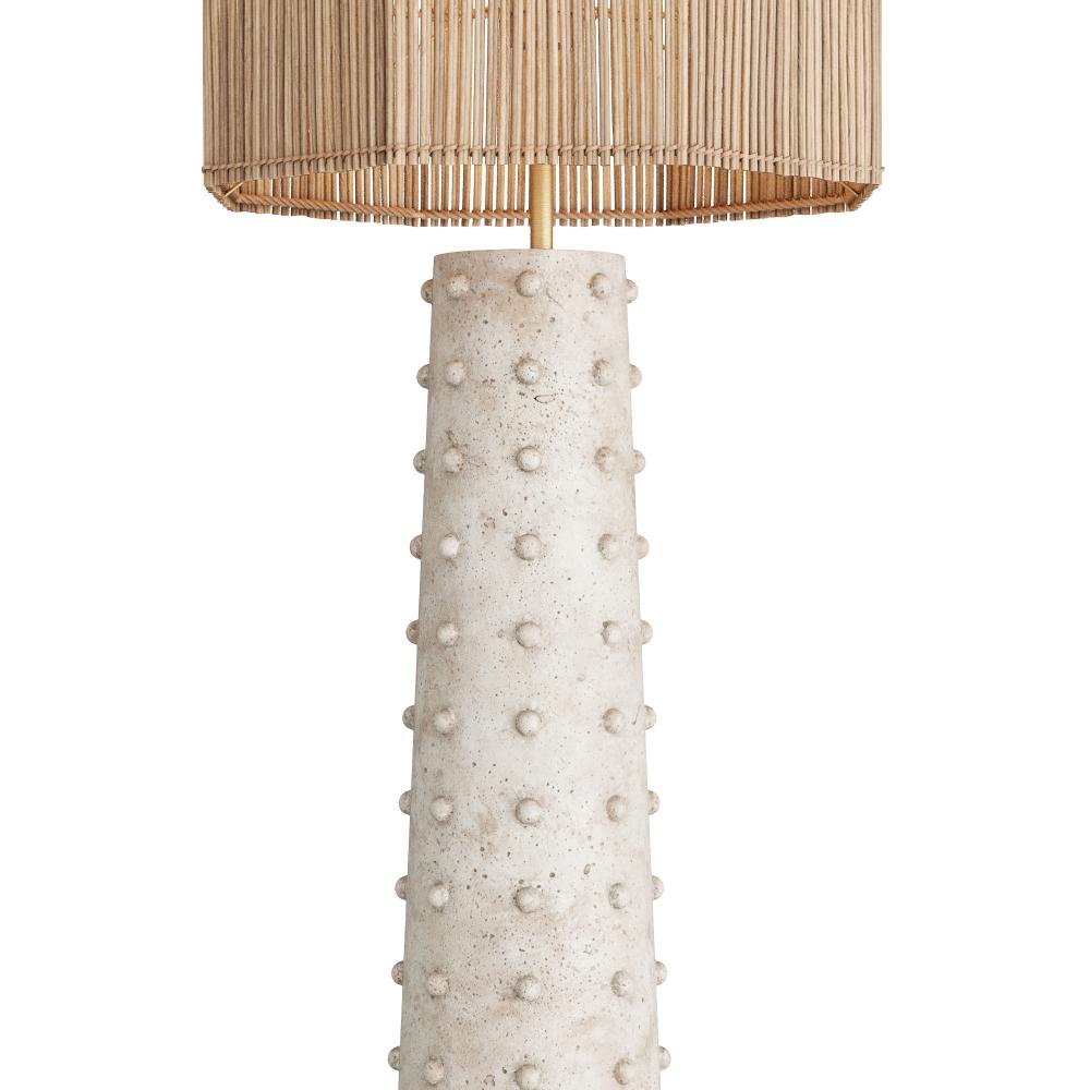 THE PERFECT PAIRING OF PLAYFUL MATERIALS. INSPIRED BY TRADITIONAL THATCHED ROOFS, THE AGNES IS TOPPED WITH AN UNLINED SHADE OF NATURAL COCO RIB THAT ALLOWS LIGHT TO PLAYFULLY PERMEATE ANY SPACE. A GENTLY TAPERED BASE OF MACTAN STONE FINISHED RESIN DELIGHTS THE EYE WITH TEXTURAL DETAILS OF BEADED SPHERES. ACCENTED WITH ANTIQUE BRASS HARDWARE. CLEAR SILVER CORD AND ON/OFF ROTARY SWITCH.