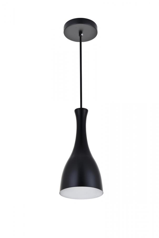 Take a chance on a fresh style with the sleek Aiken collection 1-light pendant lamp in a black exterior/white interior finish. The wine-bottle shaped shade adds a novel and playful personality combined with urbane charm that will surely create an exciting aesthetic in your dining room, living room, or entry way.
