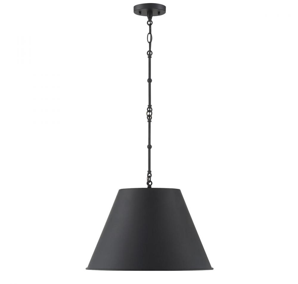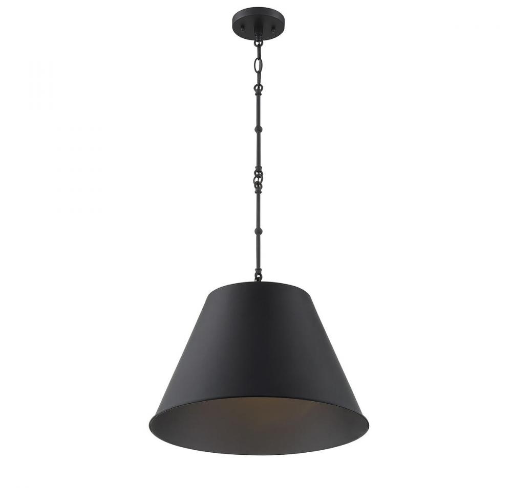 The Savoy House Alden 1-light pendant showcases the beauty of metals with an opaque shade and subtle, smart detailing on the hanging chain, creating an eye-catching visual for your home. Matte black finish. Pendants are extremely versatile and can fit in many different spaces, such as kitchens, family rooms, great rooms, foyers, entryways, offices, bedrooms and bathrooms. Because this pendant is chain-hung, you can use as much or as little chain as you need to fit your specific hanging height needs, and this pendant can be used on a sloped ceiling. Alden’s shade design concentrates light downward, so it is great for directed task lighting. You can pair Alden with hardware finished in black or mix it with hardware in other finishes. Its comfortable elegance means it is a perfect choice for rooms of any decor style. When you choose a Savoy House lighting fixture, you can be certain you've selected a piece that will withstand the test of time.