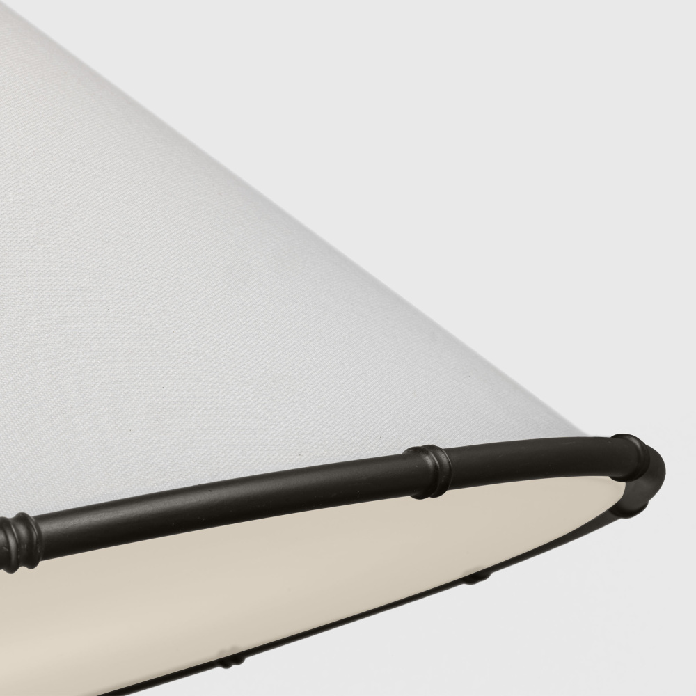 Crafted with Steel in a Aged Iron finish with silk screen white inside clear outside glass diffuser and white linen fabric shade