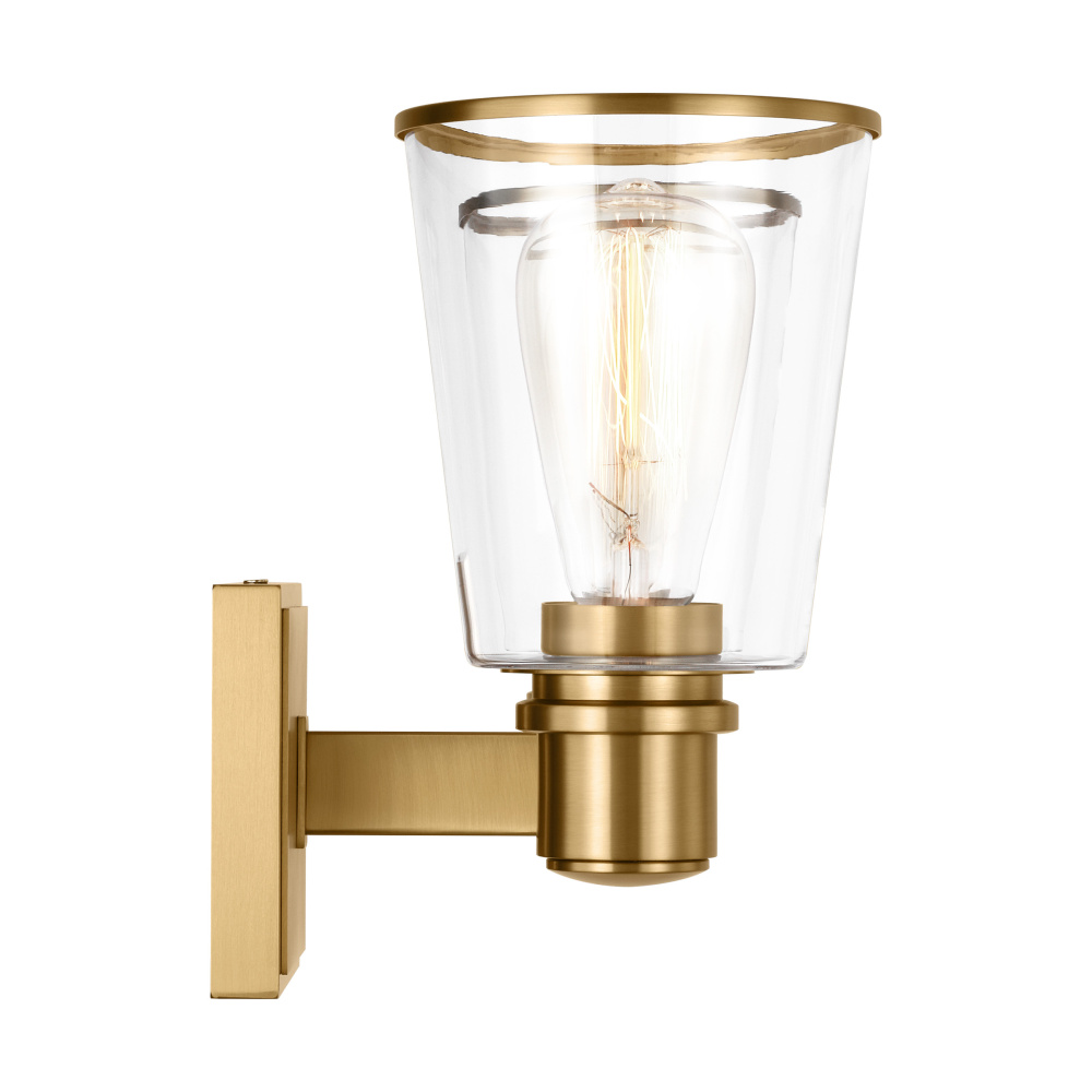 Designed by Chapman & Myers, the Alessa two light wall sconce in polished nickel is a Simple glass bathroom collection with rectangular metal arms and tapered clear glass shades. The conical clear glass shades replicate and frame the shape of the inner filament bulb. Each shade is supported by a rectangular metal arm and is capped with a thin metal rim.