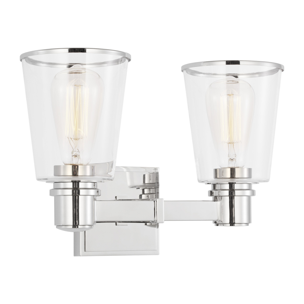 Designed by Chapman & Myers, the Alessa two light wall sconce in polished nickel is a Simple glass bathroom collection with rectangular metal arms and tapered clear glass shades. The conical clear glass shades replicate and frame the shape of the inner filament bulb. Each shade is supported by a rectangular metal arm and is capped with a thin metal rim.