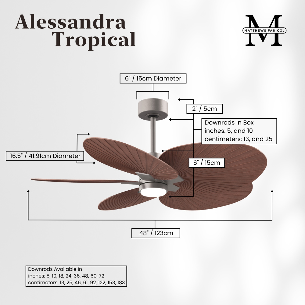Minimal tropical form with maximum efficiency in 48". The thoughtfully crafted and versatile wet location Alessandra Tropical will complement any aesthetic and improve the health and comfort of any room. Highly customizable, the Alessandra Tropical is available in 5 different body finishes, 10 blade finish options and color changing light kit. Backed by a limited lifetime warranty, our fans are of the highest quality and will dutifully perform for years to come.