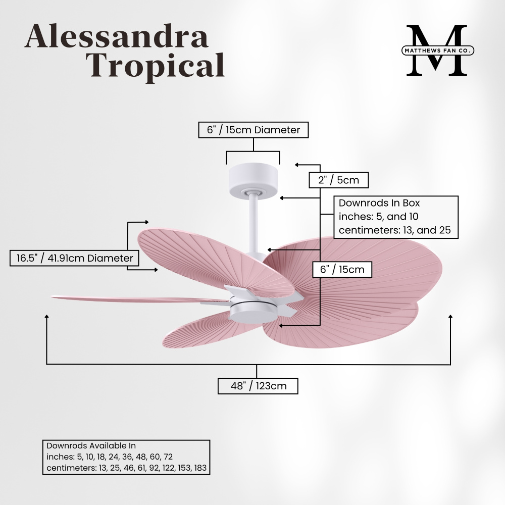Minimal tropical form with maximum efficiency in 48". The thoughtfully crafted and versatile wet location Alessandra Tropical will complement any aesthetic and improve the health and comfort of any room. Highly customizable, the Alessandra Tropical is available in 5 different body finishes, 10 blade finish options and color changing light kit. Backed by a limited lifetime warranty, our fans are of the highest quality and will dutifully perform for years to come.