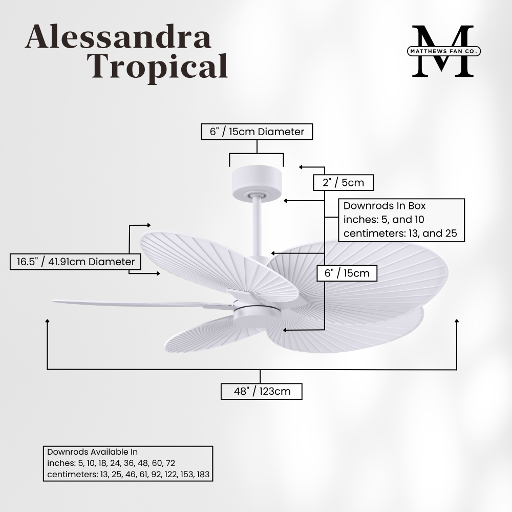 Minimal tropical form with maximum efficiency in 48". The thoughtfully crafted and versatile wet location Alessandra Tropical will complement any aesthetic and improve the health and comfort of any room. Highly customizable, the Alessandra Tropical is available in 5 different body finishes, 10 blade finish options and color changing light kit. Backed by a limited lifetime warranty, our fans are of the highest quality and will dutifully perform for years to come.