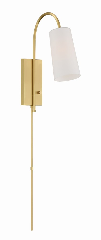 The Alexa wall sconce is defined by its simple yet stylish design. Its rectangular backplate features a sweeping slender arm and tapered white glass shade. This ideal lighting design is perfect for a bedside or reading nook and is available in three finishes.