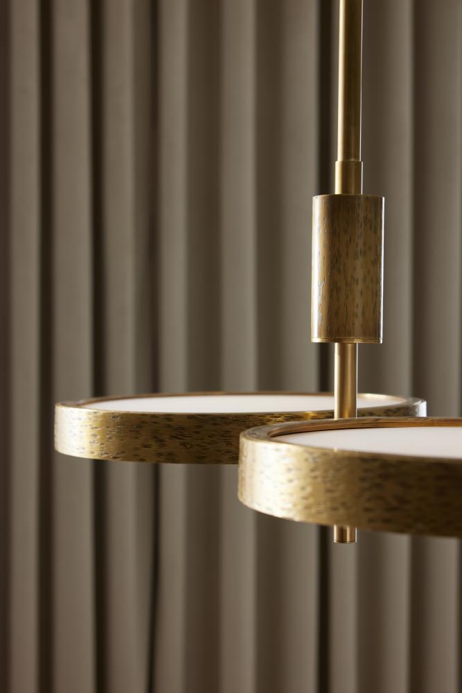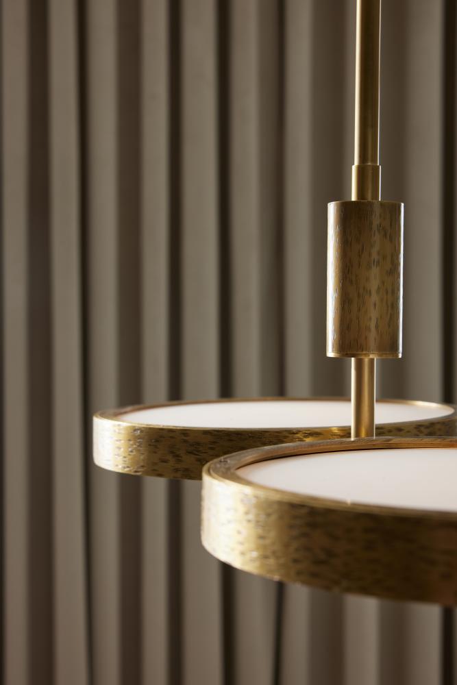 Dual shallow drums finished in antiqued brass with a detail of chattered antique brass for visual appeal. Reminiscent of a pair of antique eyeglasses, this unique fixture is finished with glass shades in a swirl texture over integrated LED to perfectly diffuse light. Damp-rated, although limited covered outdoor conditions may affect finish. Finish will vary.