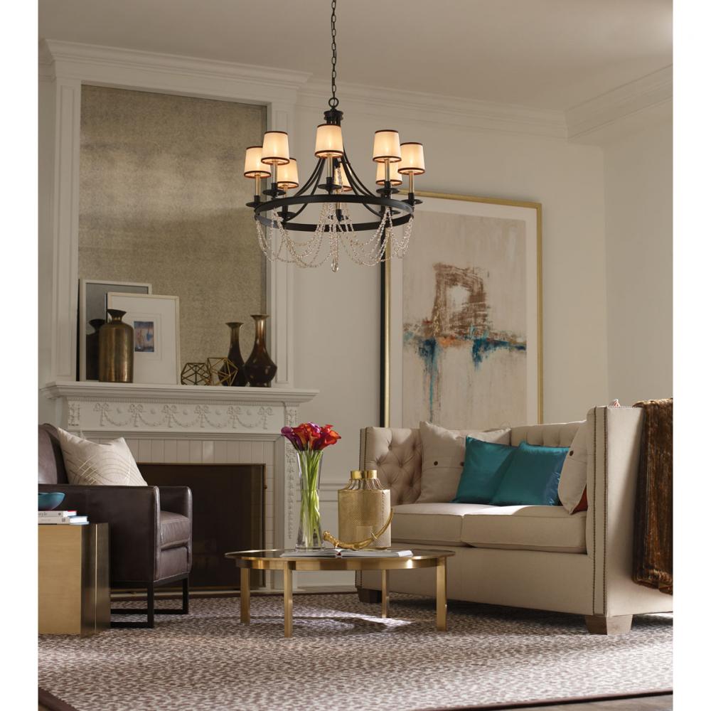 For those looking for an added sparkle in their homes, Allaire provides a casual luxe feel to any decor. Alternating oval and round vintage beads create beautiful strands that are completed by a large faceted glass pendalog. Champagne candles and an Antique Bronze finish add to the sophisticated design details. This eight-light chandelier is part of our Design Series collection. Two shade styles, both featuring a rich Espresso trim, are available as accessories. (P860000-001, P860001-001).