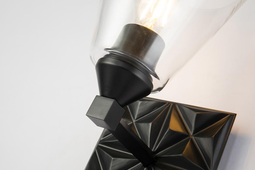 A 6.5" textured square backplate sconce in matte black with a cone-shaped clear shade. Mounts up or down, delivering modern texture and detailed design to any room.
