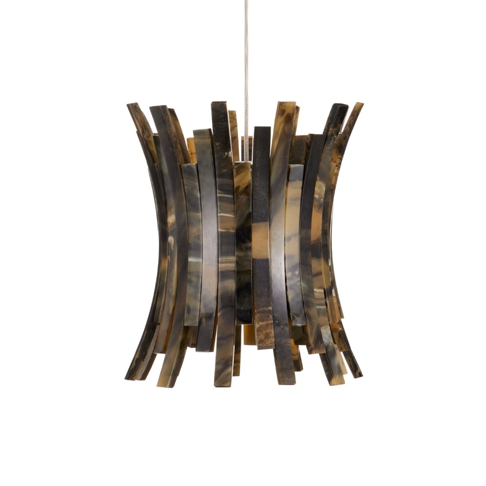 The shades of the Alsop Rectangular 15-Light Multi-Drop Pendant were inspired by tortoise shell bracelets that were popular during the era when Hollywood glamour was at its height. Made of composite with faux-horn surfaces, the shades on the brown pendant will be warm elements in a space. A refined aspect of the design is how the ribs arc outward and how they are staggered for greater texture than their surfaces bring. The canopy of this piece is luminous in a painted silver finish. This fixture is among Currey & Company's introduction of cluster lights, which includes multiple configurations.