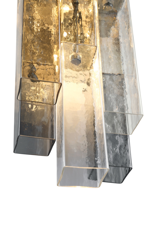 A series of stepped square balusters are the backbone of a staircase; adding grace and strength to a functional element in a building. Using this same tiered visual, Altesa dresses square frames with elongated square tubes of glass. The varying lengths, tones and densities of glass influence the depth and color of light, presenting a mesmerizing display in grand proportions.