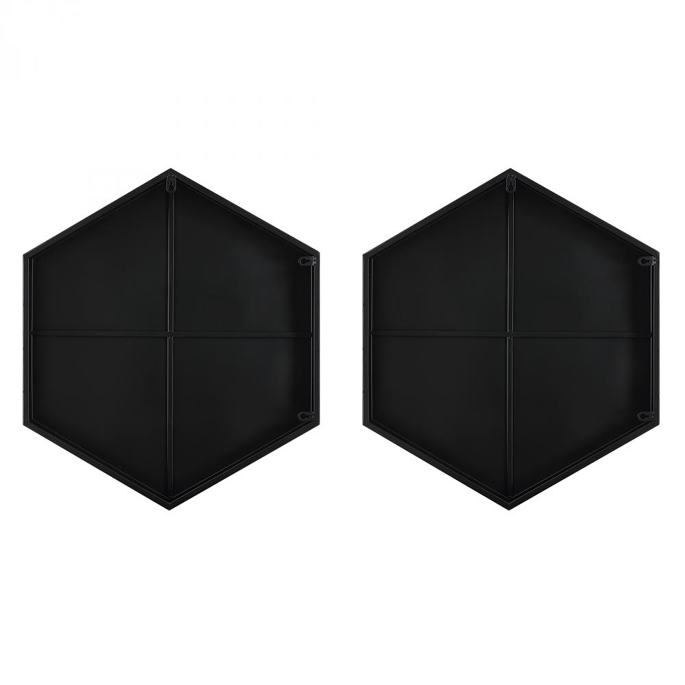This set of two hexagon mirrors are encased in thick iron bands finished in a soft matte black. Each mirror has a 1" bevel and may be hung horizontal or vertical.