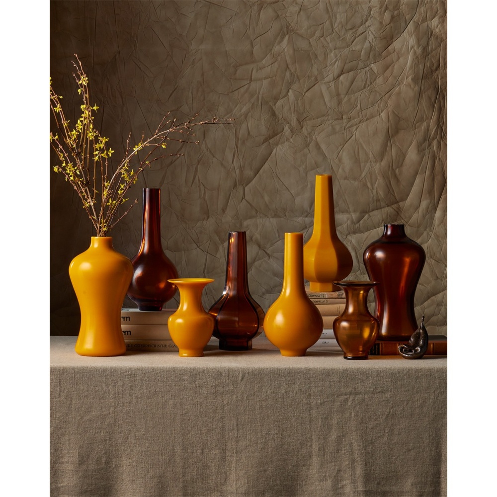 The Amber & Gold Peking Maiping Vase is made of glass that is of an exceptional density and weight. The centuries-old methods that result in such remarkably thick and luminous glass is achieved by only two small factories whose artisans have the skills and know-how to successfully achieve the excellent quality evident in this amber glass vase. These are modeled after artifacts that were once produced for the Chinese Imperial palace.