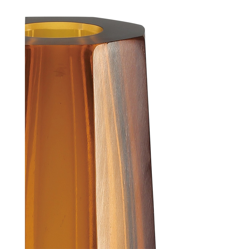 The Amber & Gold Peking Stem Vase is made of glass that is of an exceptional density and weight. The centuries-old methods that result in such remarkably thick and luminous glass is achieved by only two small factories whose artisans have the skills and know-how to successfully achieve the excellent quality evident in this amber glass vase. These are modeled after artifacts that were once produced for the Chinese Imperial palace.