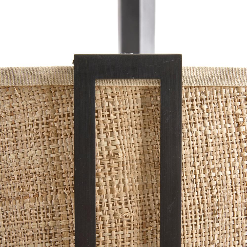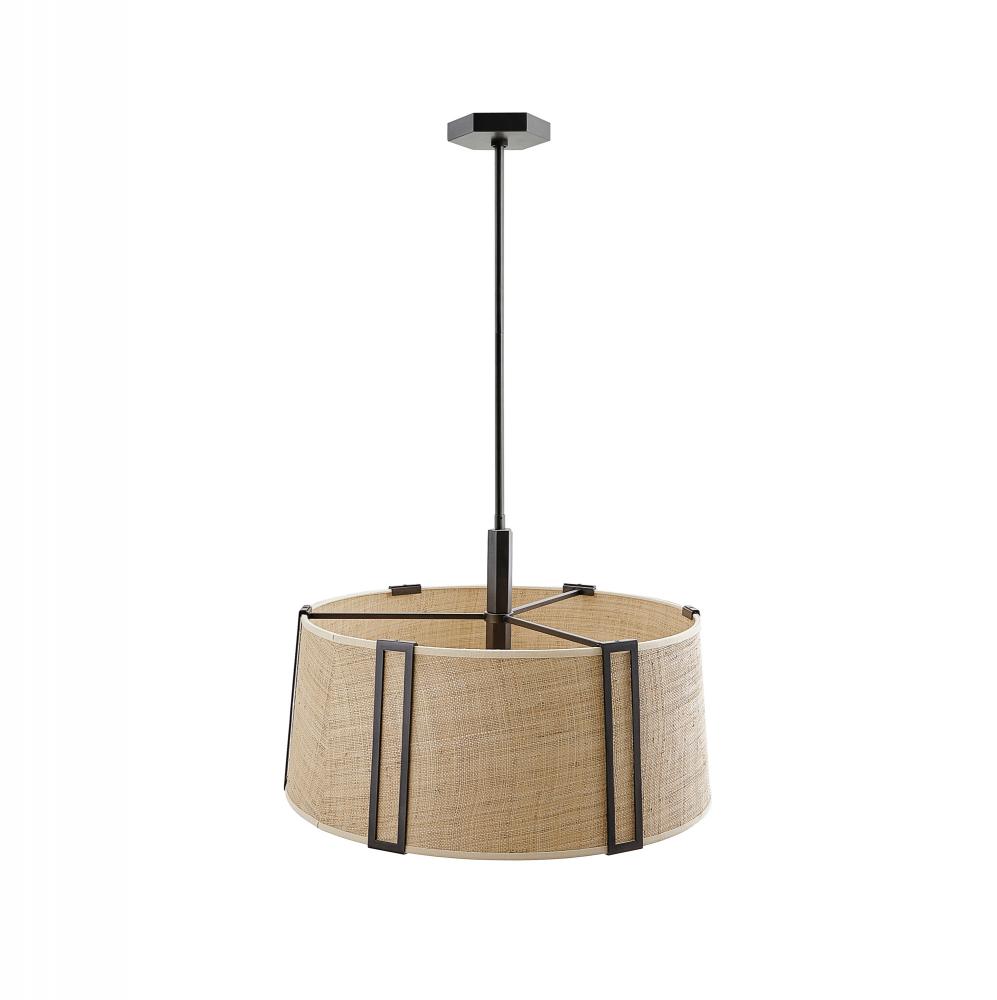 Traditional menswear accessories add a tailored twist to our classic pendant light finished in English bronze iron. A circular shade of natural grasscloth is cuffed with metal accents that recall of mid-century tie clips. Damp-rated, although limited covered outdoor conditions may affect finish. Finish will vary.