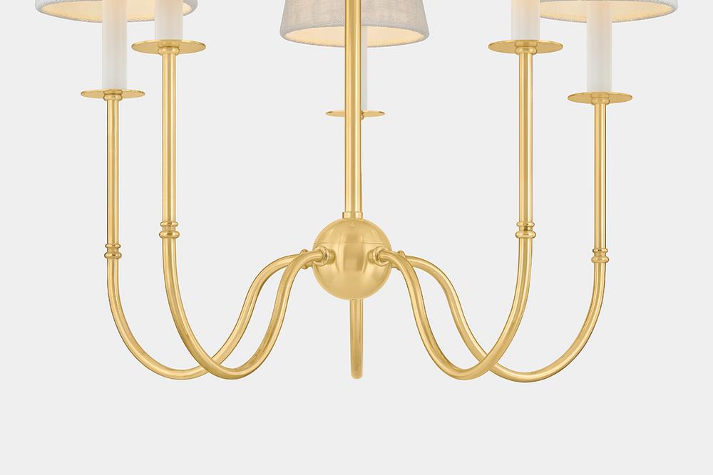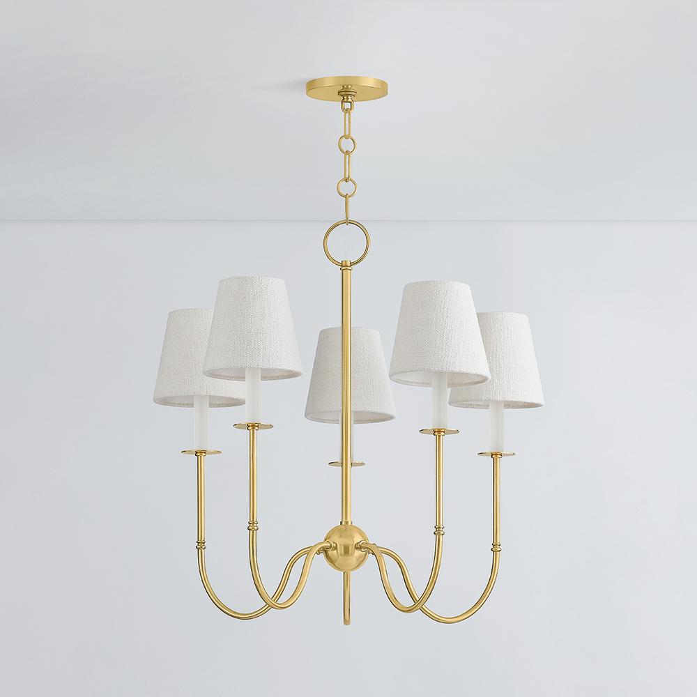 Vintage meets modern in the Amina family. Traditional Victorian metalwork details, including wide bobeches, are paired with contemporary candle sleeves and short white linen shades. Finished in Aged Brass, the slender, elongated J-arms feature a dramatic swoop. Whether as a sconce or 5 or 9-light chandelier, Amina provides a fresh update to traditional forms.