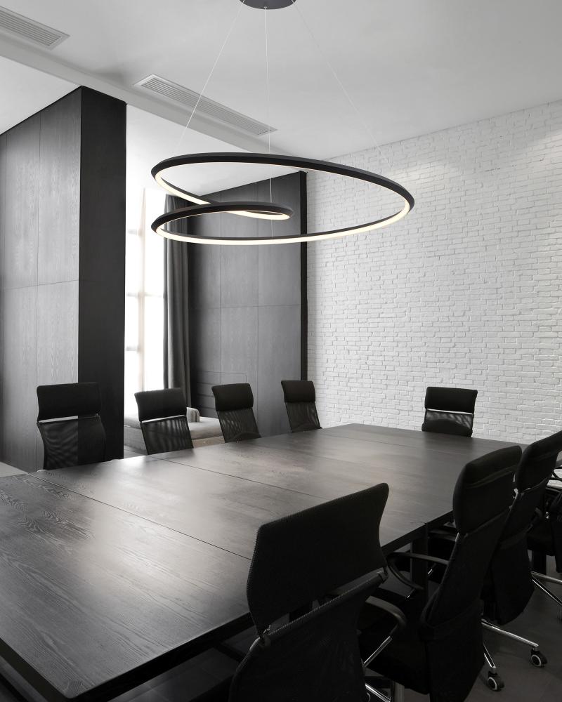 Triangular in section the interior arcing surface of the lamp structure emanates light while the profile tapers into a razor thin edge. Available in two sizes the gestural Ampersand chandelier provides a reductive aesthetic focus but accomplished with a poetic flair.