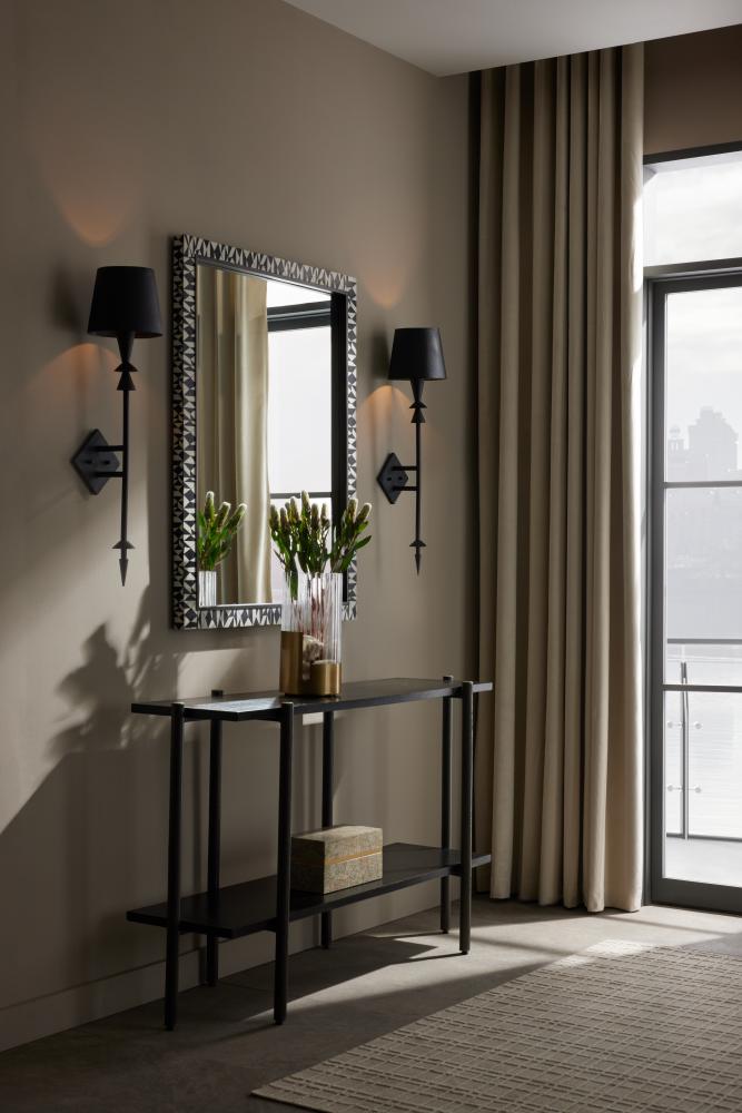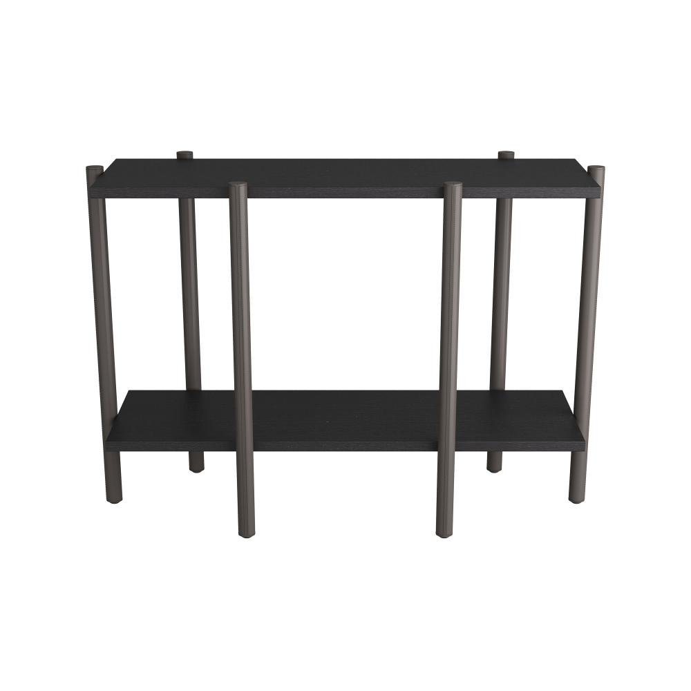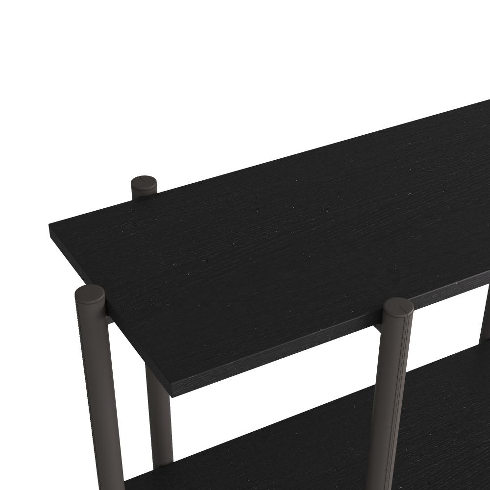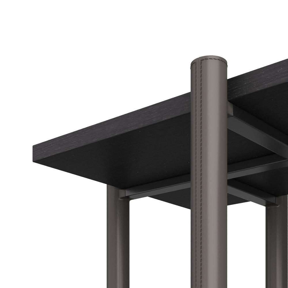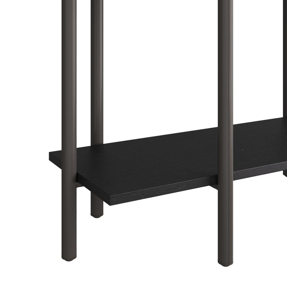 Minimal and understated, the good hand of a wrapped steering wheel influenced the design of the oak wood Andor. Offset legs wrapped in topstitched graphite leather offer a textural counterpoint to a balanced pair of ebony-finished oak wood shelves. Leather and wood will vary.