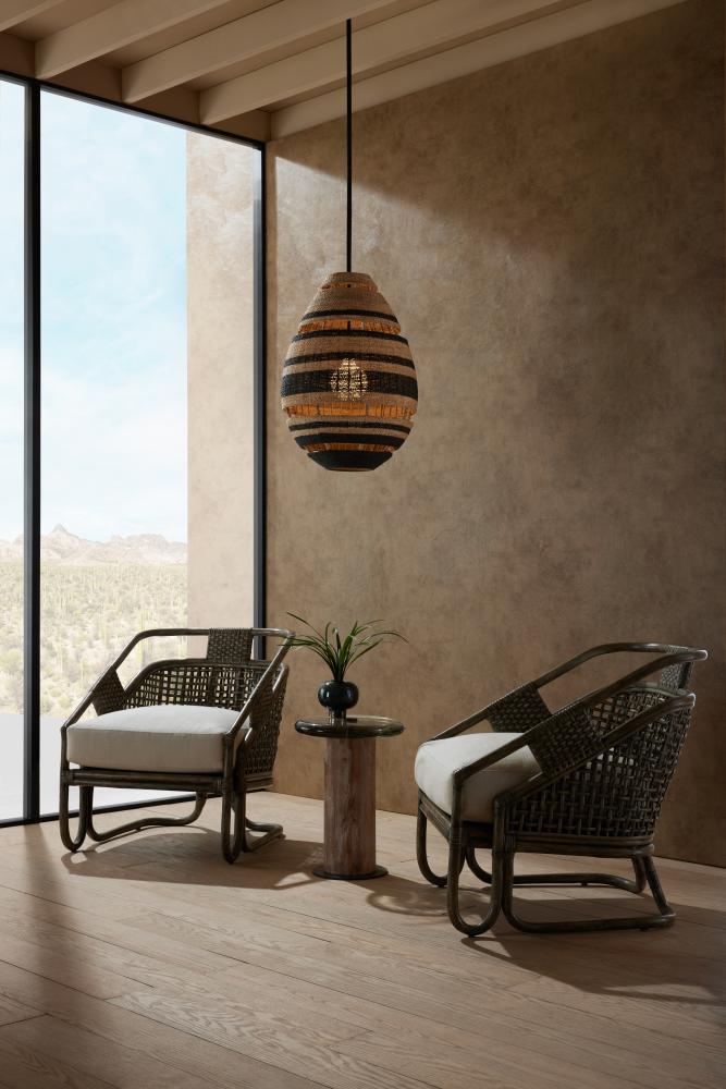 An alluring mix of dark and light, the sustainable Anila is the very definition of mood lighting. Its natural and black-stained abaca shade is woven to present layers of transparency and opaqueness that draw the eye. Suspended from a slim iron pipe coated in matte black. Finish will vary.
