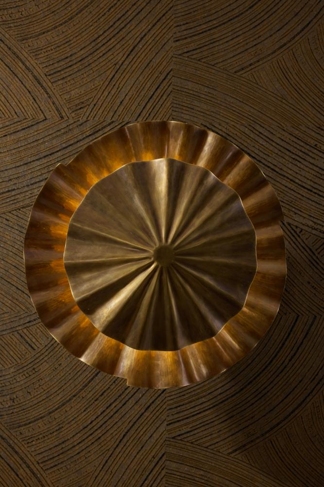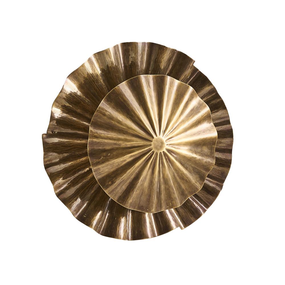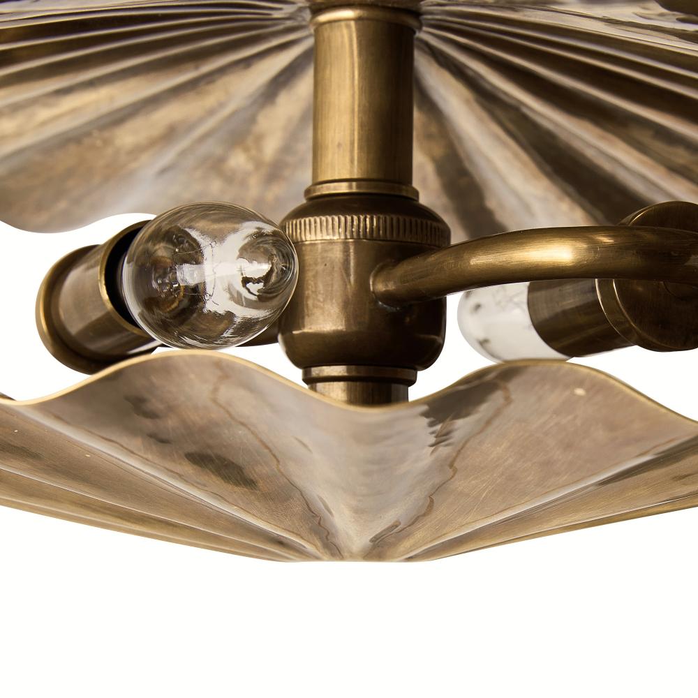 The natural fluted texture of gingko leaves informed our organically appealing fixture of vintage brass. The Annabeth has two staggered layers delivering an extra play of light and shadow. This clever design can be used as a flush mount or as a sconce. Damp-rated, although limited covered outdoor conditions may affect finish. Finish will vary.