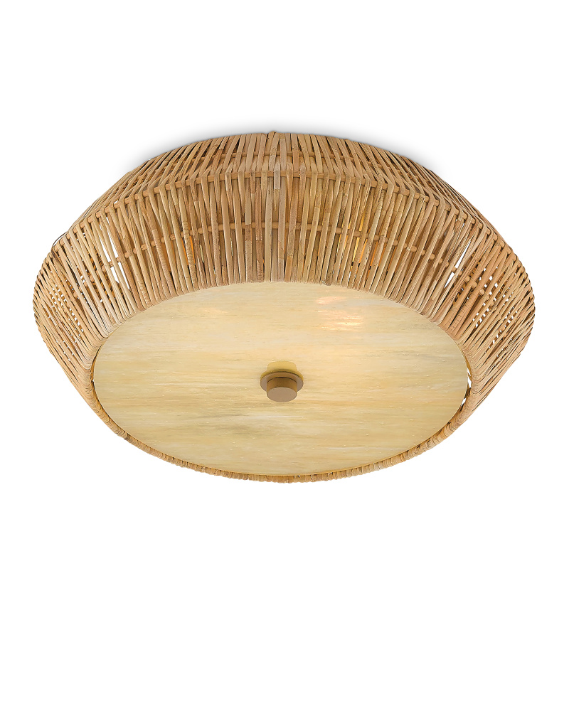 Painstakingly woven by artisans who use traditional techniques, the Antibes Flush Mount is a marriage of artistry and high-quality construction. Natural rattan forms the outer ring of a geometric cage fitted with an art glass diffuser to create the rattan ceiling light.
